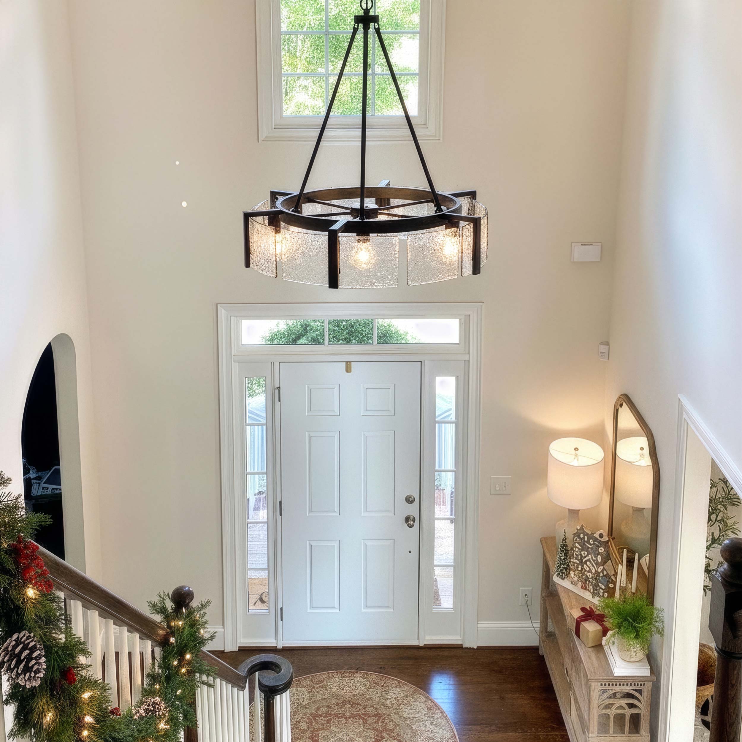 With its hammered water glass and clean, structured frame, Aenon is our go-to for spaces that need both drama and polish. The rippled glass softens glare while catching the light beautifully, making dining rooms, foyers, and living spaces feel instantly elevated.