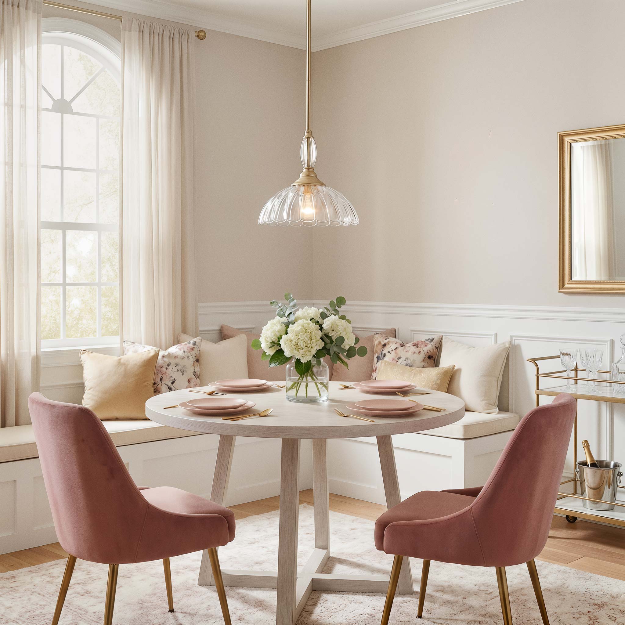 Scalloped opal glass diffuses light softly for a composed, welcoming finish.