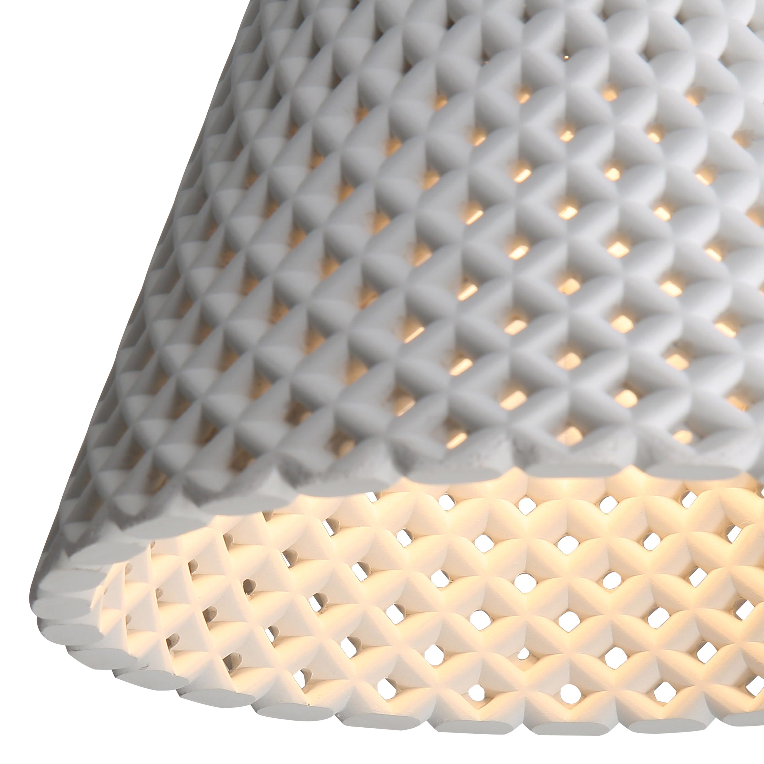 Clarus plays with shadow and light. Its perforated form glows softly from within, adding architectural rhythm to ceilings and walls.